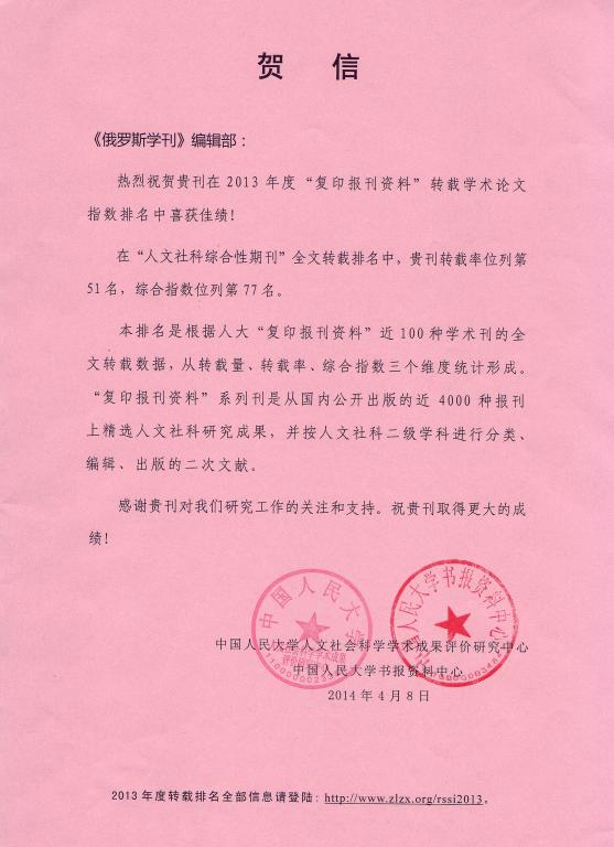 近日,中国人民大学人文社会科学学术成果评价研究中心、中国人民大学书报资料中心给《俄罗斯学刊》发来贺信,热烈祝贺我刊在2013年度“复印报刊资料”转载学术论文指数排名中成绩突出,在全国“人文社科综合性期刊”全文转载排名中,我刊转载率位列第51名,综合指数位列第77名。