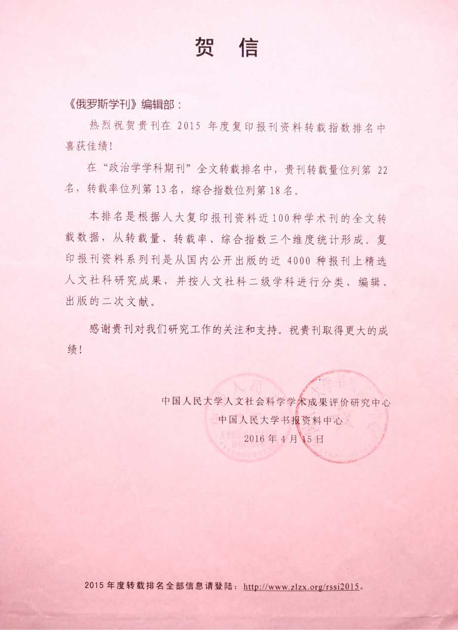 近日,中国人民大学人文社会科学学术成果评价研究中心、中国人民大学书报资料中心给《俄罗斯学刊》发来贺信,热烈祝贺我刊在2015年度“复印报刊资料”转载学术论文指数排名中成绩突出,在“政治学学科期刊”全文转载排名中,《俄罗斯学刊》转载量位列第22名,转载率位列第13名,综合指数位列第18名。